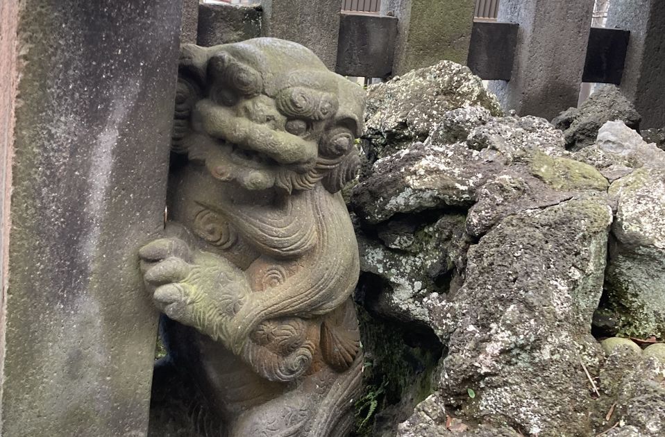 後にも先にも、こんなにお茶目な狛犬を見たことがないです。本来の狛犬はちゃんと台座にいるんですが、その仔犬が脱走して石柱の陰からこっちを見ているんです!