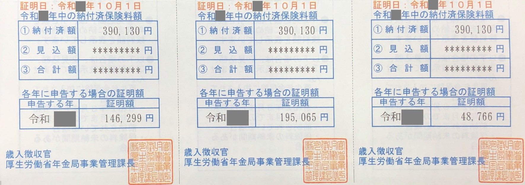 なお、この3年分の社会保険料控除証明書のイメージは、例えばこんな感じです。